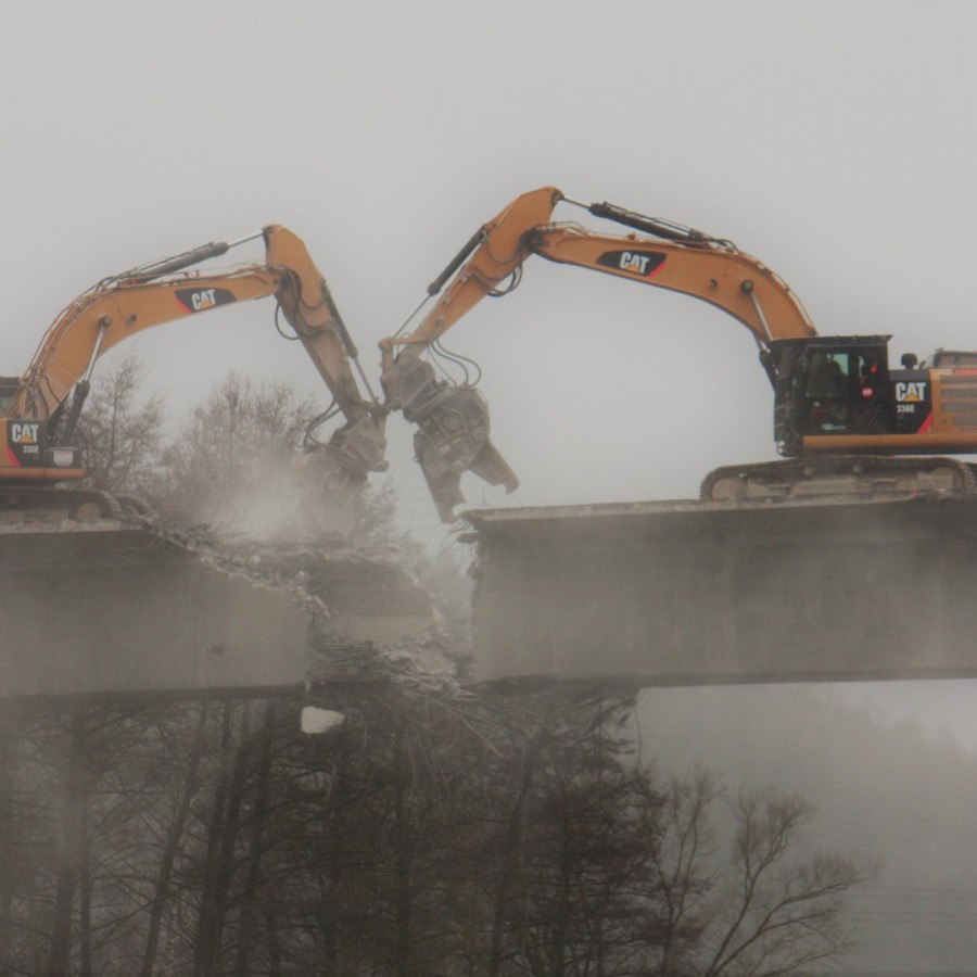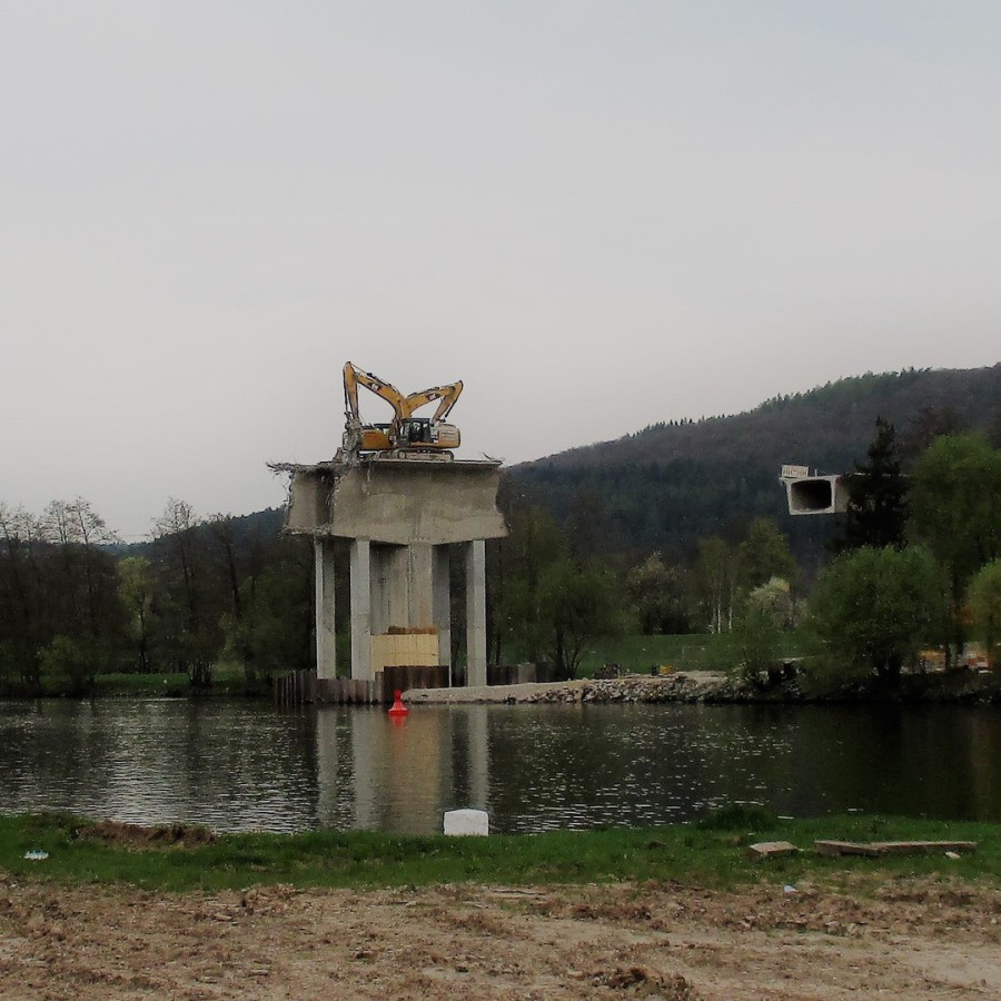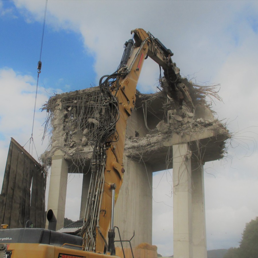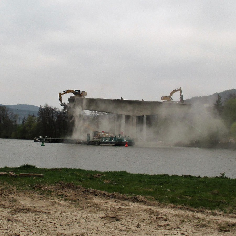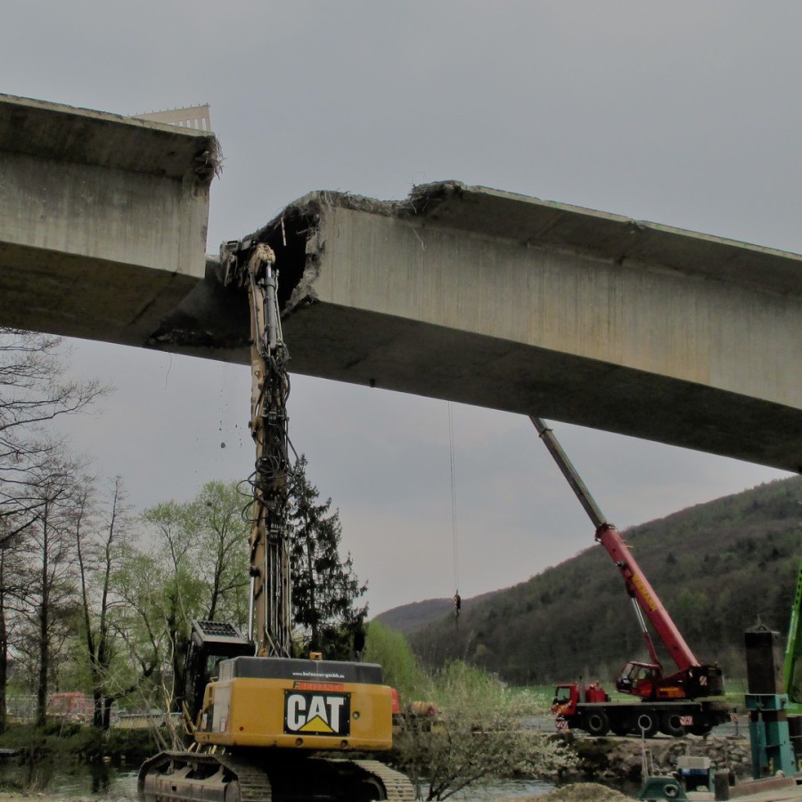 Die Sperrzeit des Mains betrug nur drei Wochen. Die Abbruchmassen der Überbaus betrugen ca. 2.300 m3, die restlichen Bauteile wurden teilweise sprengtechnisch und mit einem Lonfrontbagger abgebrochen.